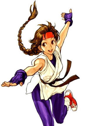 Yuri with a pink gi, black pants, pink shoes, and brown hair. |